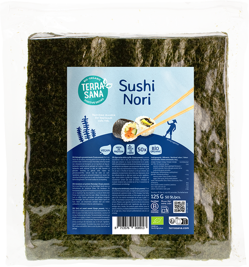 El sushi no puede existir sin el sushi nori. Estas hojas son extra crujientes; puedes enrollar tu relleno favorito sin ningún esfuerzo. Este nori está certificado como biológico, ¡lo que es bastante especial para las algas!
